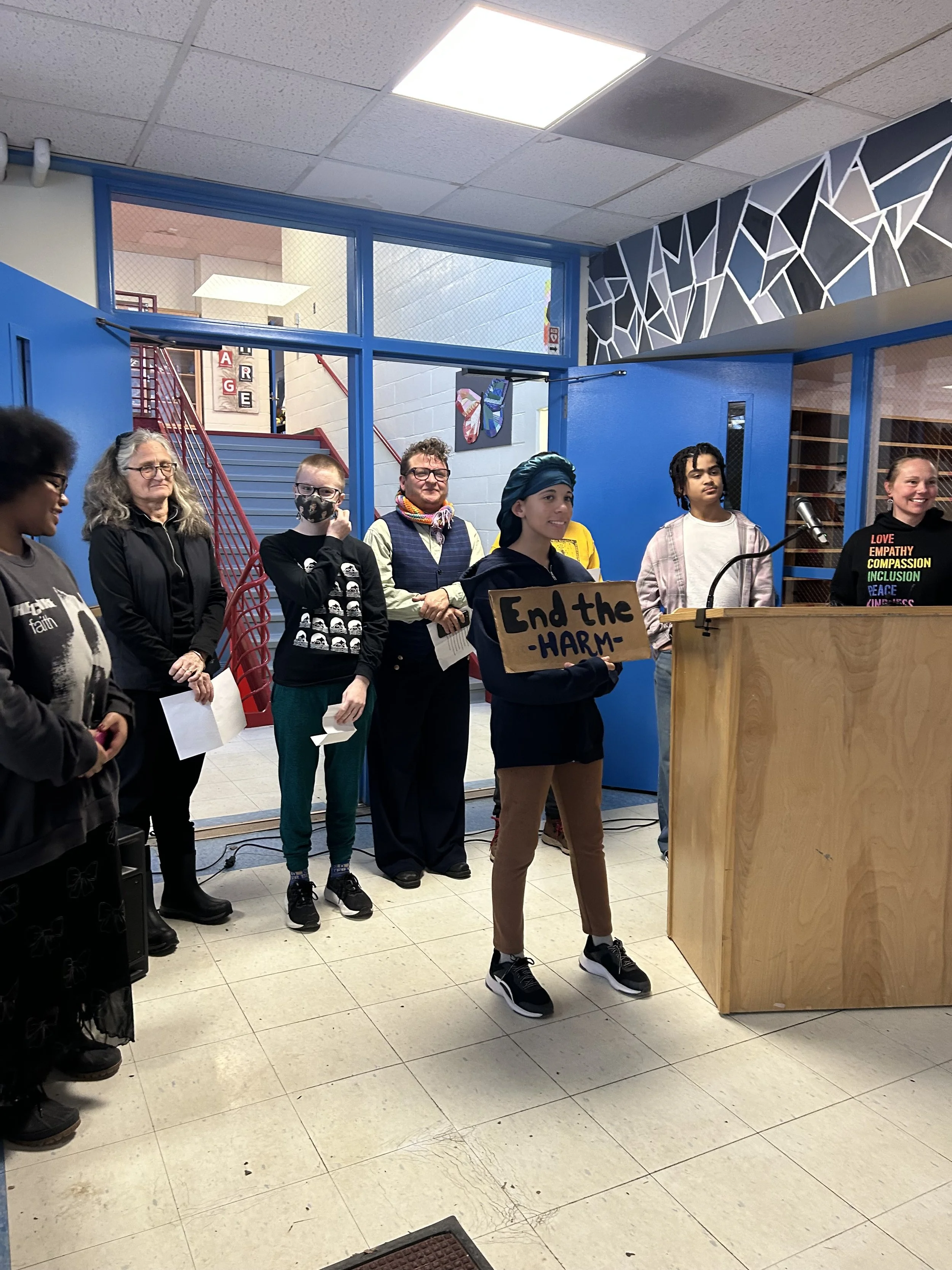 On December 3rd, we co-hosted a press conference with Outright Vermont at Essex Middle School to announce the next phase of Narratives for Change, a statewide campaign calling on policymakers and the Agency of Education to implement student-driven priorities addressing the growing crisis of hazing, harassment, and bullying (HHB) in Vermont schools. You can see coverage about the press conference on WCAX and Colchester Sun.